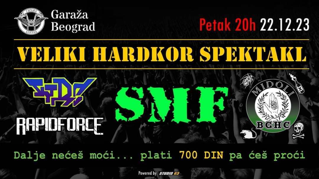 December 27, 20168 yr comment_2942321 Početak svirke: 22:30h Ulaz: 500 din. Za ljubitelje čvršćeg zvuka. Čekamo vas. Dostupan je i novi album "Boli glava" http://smfband.com/sr_music.html Spisak pesama: 01. Kredit 02. Dijeta 03. Voznja 04. Birtija 05. Malo Ona 06. Parking 07. Bori se 08. Salter 09. Ratna 10. Anti-Ratna 11. Struja 12. Promene 13. Evropa 14. Kockar 15. Narodna Medicina 16. Rostilj 17. Vjezd Gladiatoru CD je dostupan i kao zvanično fabričko izdanje. Možete ga naručiti preko benda na e-mail: [email protected] ili putem oficijalne Facebook stranice www.facebook.com/smfofficial . Cena je 500 din. www.SMFband.com www.facebook.com/SMFofficial www.youtube.com/SMFofficial Report